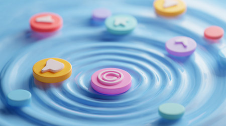 Colorful buttons on blue water surface. 3d rendering. Computer digital drawing.