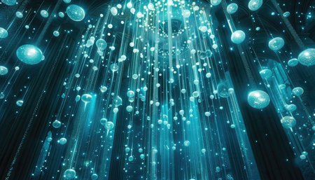 This captivating abstract image features glowing particles interconnected by delicate luminous threads against a dark background, representing the beauty of networks and communication.