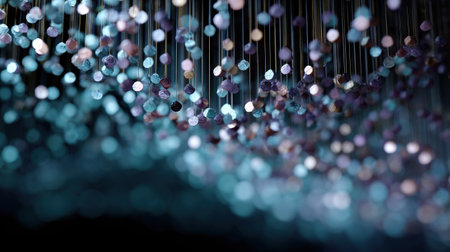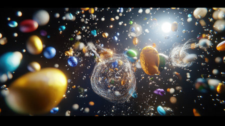 This captivating image features an explosion of shimmering particles on a surface, creating a vibrant and colorful abstract display of light and elegance.