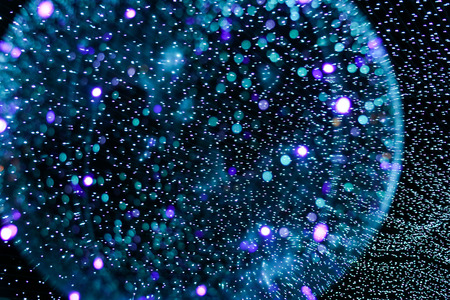 Many illuminated balls hung and linked by threads creating an infinite perspective as abstract blue background
