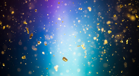 A vibrant and festive abstract background filled with shimmering golden confetti and soft, glowing bokeh lights. The background a gradient of colors, transitioning from deep blue to bright teal and purple. The golden confetti pieces are scattered dynamically, catching the light and creating a sense of movement and celebration. The bokeh lights add a soft, dreamy to the scene, enhancing the festive and magical atmosphere.