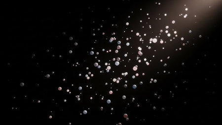 Against a deep black backdrop, a multitude of small, luminous particles are scattered and appear to be drifting. A soft, warm light source from the upper right casts a gentle glow, highlighting some of the particles and creating subtle bokeh effects. The particles are varied in their intensity and color, with hints of pink and blue mixed with the dominant white and yellow tones. This abstract composition evokes a sense of gentle movement and ethereal beauty.