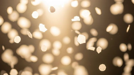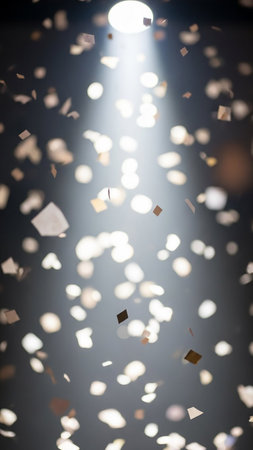 Golden and white confetti pieces are scattered and falling through a bright spotlight beam against a dark grey background, creating a festive and celebratory...