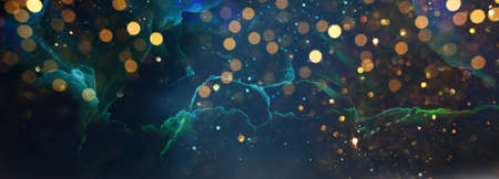 background of abstract glitter lights. blue, gold and black. de focused. banner