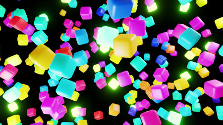 3d abstract simple geometric background with multicolor cubes flash neon light. Cubes fly in the air. Creative simple motion design background with 3d objects. 3d render