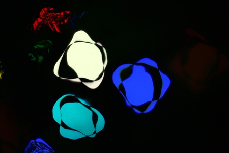 Stock showing abstract composition of intertwined neon rings and scattered circles in vivid blue green pink and red against a black background. resolution...