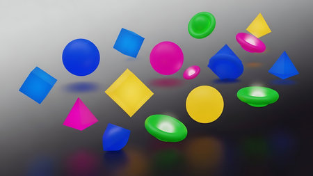 A collection of colorful 3D geometric shapes, including spheres, cubes, and triangles, float against a gray background. The shapes are vibrant and shiny, with a reflective The a mix of pink, blue, yellow, and green colors, creating a visually appealing and artistic composition.
