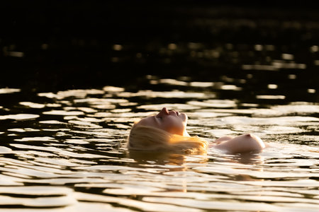 A serene portrait of a blonde woman floating calmly on water, captured in soft golden evening light. Her face and body reflect tranquility, vulnerability, and connection to nature. Artistic and sensual, this series blends light, movement, and emotion