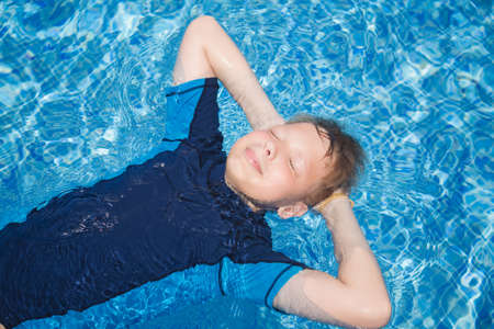 Cute blond white kid relaxing in clear blue water of outdoors sunny swimming pool laying calmly on back. Horizontal color photography.