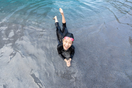 Cute asian kid with swimming suit activity.