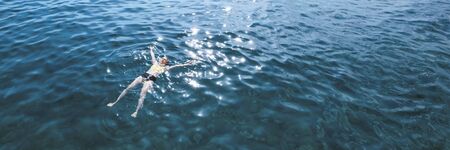 Boy swims in the blue tropical sea. hot summer.