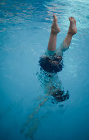 A child dives into the water, feet look out of the water.