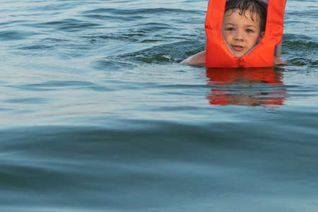 Child learning to swim in outdoor. Little kid boy at beach during summer vacation. Summer vacation and travel concept.