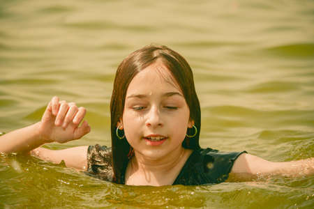Close up of young beautiful girl in water. A girl swims in the river.Teenager girl on vacation. River, summer, swimming, nature