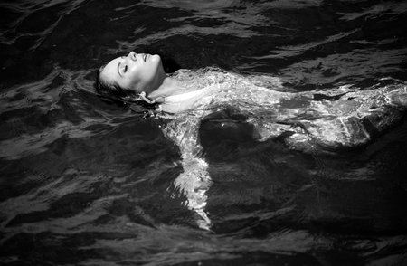 Sexy seductive woman wearing black dress in swimming pool water. Young attractive alluring girl floating.