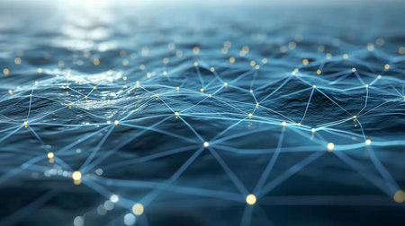 This abstract image showcases interconnected lines and glowing nodes on a reflective surface, illustrating the concept of digital communication and modern technology.