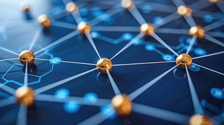 3D digital network with interconnected nodes, abstract design, no people, room for text