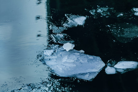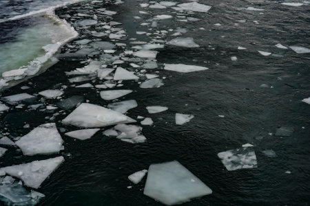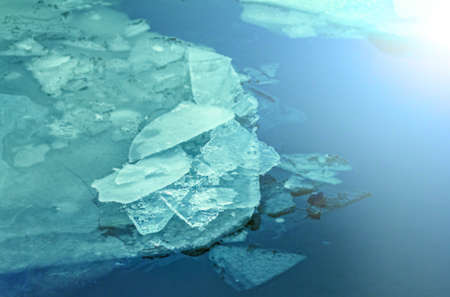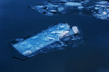 Natural ice blocks in water. Sea ice during freezing winter weather.
