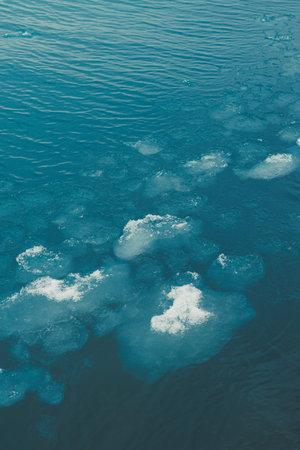 close-up shot of glacier blue ice pieces floating in water, Iceland