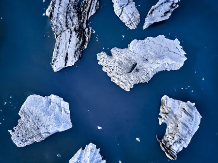 Aerial drone view of floating icebergs in Jokulsarlon glacier lagoon in Iceland, top view