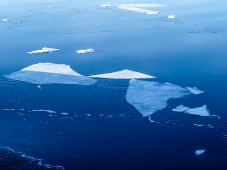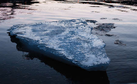 Floe floating on the sea. Frozen pieces of ice in the water. Winter season.