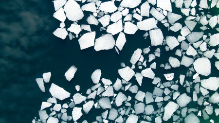 Kayak sailing between ice floes on the lake. Aerial drone view. abstract nature background. Baikal lake, Siberia, Russia. spring landscape