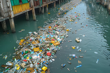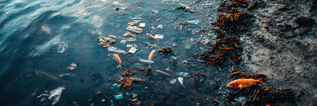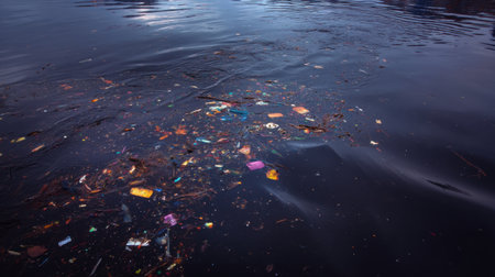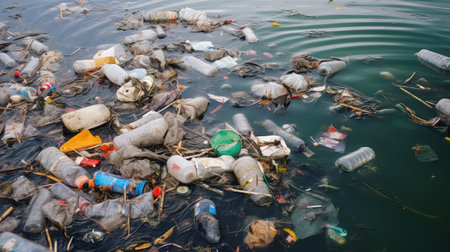 Pollution water bodies is significant environmental issue, as seen this of floating debris and waste. scene captures impact of human activity aquatic ecosystems, highlighting urgent need