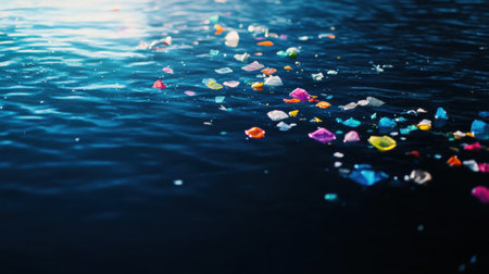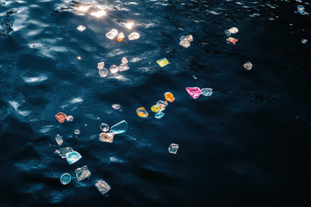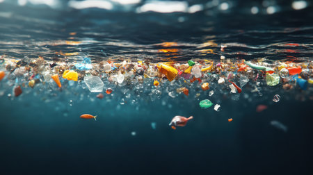 Bright plastic debris rests on the surface of the deep blue ocean, showing the critical issue of marine pollution affecting ecosystems.