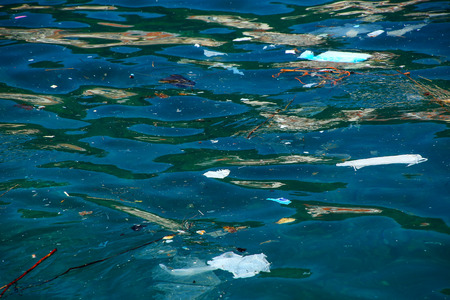 Close up of plastic bags, batteries, food waste and other types of garbage in the blue water. Ecological disaster and pollution of the world ocean concept. Horizontal shot