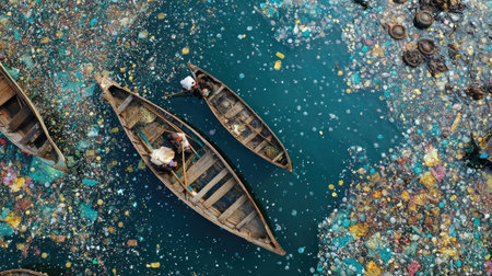 This aerial photograph captures traditional wooden boats traversing through polluted waters, illustrating the critical environmental challenges posed by plastic waste.
