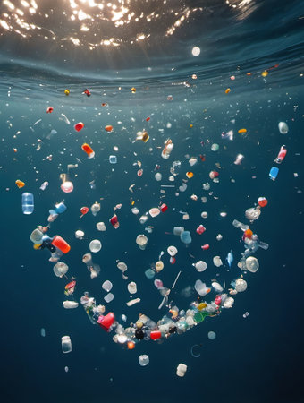 This captivating underwater scene reveals the alarming sight of plastic pollution, showcasing colorful debris and microplastics suspended in clear ocean water.