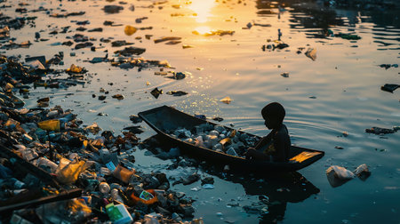 silhouettes a child who sits in a boat and catches garbage from the river. A boat floats in the middle of a river made of garbage. Environment pollution problem. Nature conservation concept.