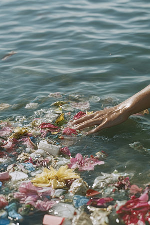 A hand reaches into clear water, collecting colorful debris and plastic waste from the ocean surface.