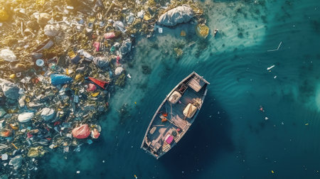 An aerial view captures the shocking reality of a boat navigating through a vast patch of plastic garbage and waste floating in the ocean, highlighting the urgent environmental crisis of water contam.