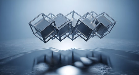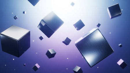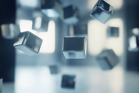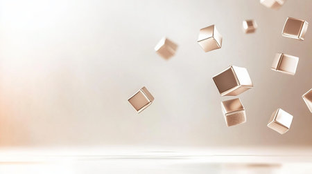 This image features elegant metallic cubes floating in a soft-lit environment, creating an abstract and modern visual. Perfect for technology, design, and luxury themes.