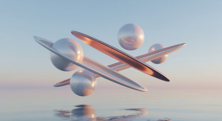 Geometric pearlescent metallic spheres and rings interlock in an abstract composition, reflecting on a calm water surface under a soft gradient sky.