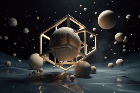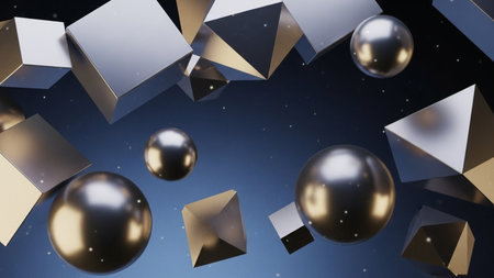 3d illustration of abstract geometric composition with gold and silver spheres.