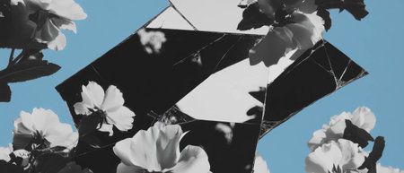 Exploration of reflection and distortion in a minimalist collage of geometric shapes and flowers
