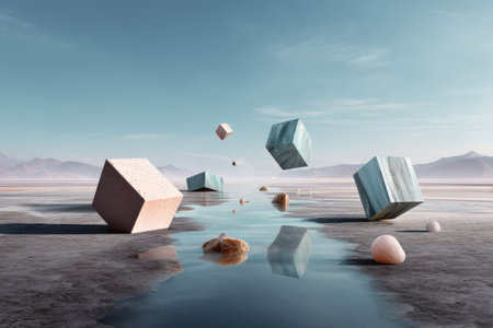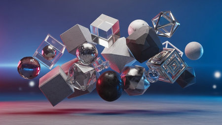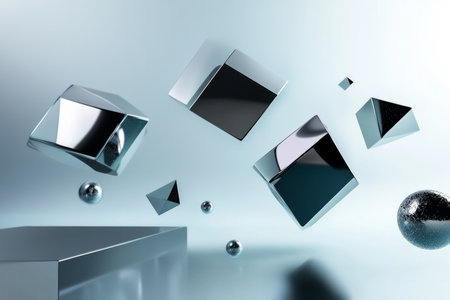 floating geometric shapes, seamlessly arranged with smooth reflective surfaces, giving off a futuristic and minimalist vibe.