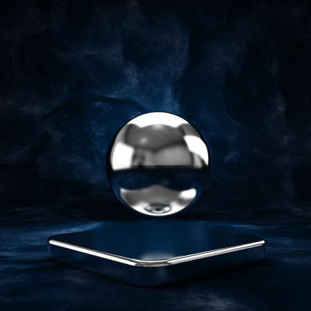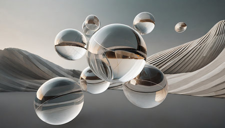 Multiple shiny metallic spheres hover above a smooth surface, reflecting light and creating a mesmerizing visual effect. The arrangement offers a modern aesthetic, emphasizing textures and reflections.