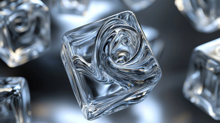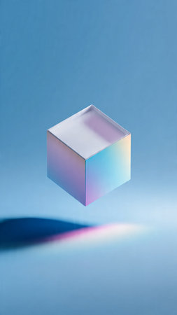 Transparent Floating 3D Cube Abstract Geometric Design Minimalist modern 3D digital art rendering with glass like crystal cube object and geometric pattern