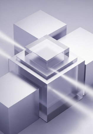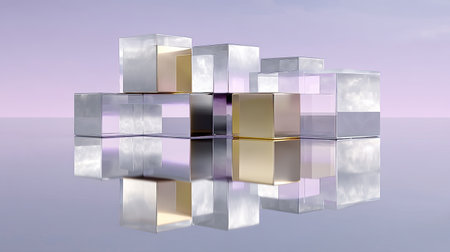This stunning image features an abstract arrangement of reflective cubes against a soft pastel background, showcasing elegant reflections on a smooth surface.