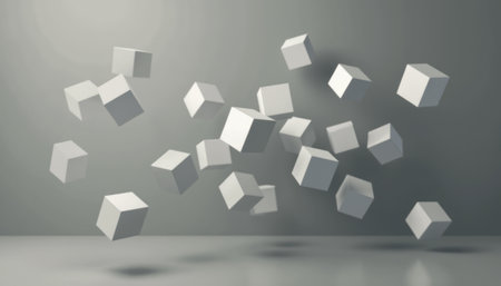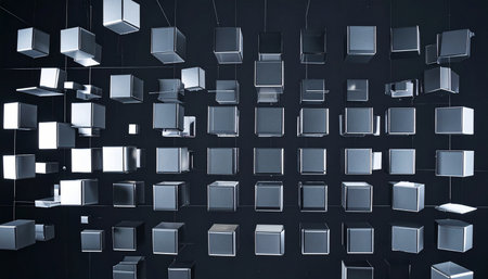 A visually striking arrangement of cubes in various shades of gray and white, with light reflections adding depth and dimension to the geometric pattern.