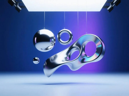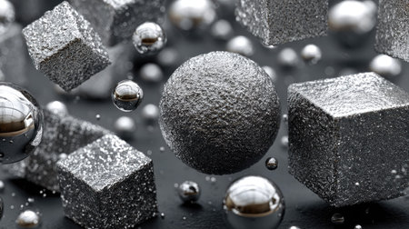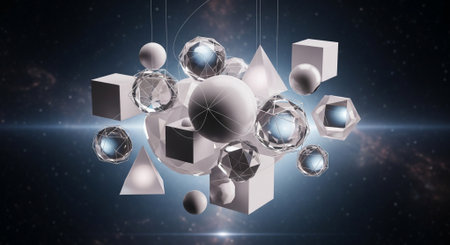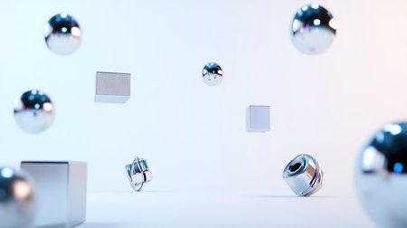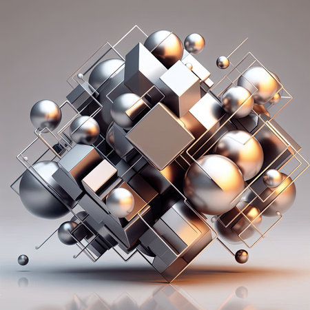 An abstract composition showcases reflective chrome spheres and cubes linked by curved metal rods with intricate...