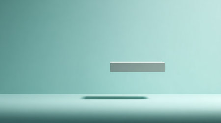 Three-dimensional rendering depicting a very clean and minimalist interior space dominated by a pale teal or mint color palette, featuring a solitary, white, rectangular block suspended horizontally mid-air, casting a slight shadow on the floor plane below it, creating an ideal empty stage for product demonstration or abstract composition.