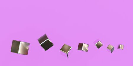 Different flying abstract metal cubes on pink background 3d rendering illustration modern design wallpaper composition