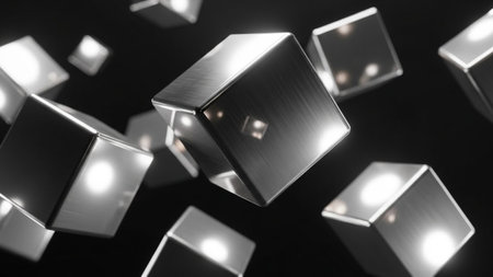 Several reflective, metallic cubes are presented against a deep black backdrop. The composition features a dynamic arrangement with blurred elements, suggesting movement. The polished surfaces reflect ambient light. Ideal for use in abstract design projects, illustrations, and various commercial purposes.