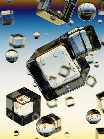 Floating showing floating geometric shapes cubes spheres and rings with translucent pearlescent finish.