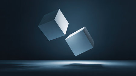 Two geometric cubes are suspended in mid-air against a dark backdrop. The cubes are bright and reflect a soft light. The composition is minimalist with emphasis on the shapes and the contrasting light and shadow. This image may be suitable for abstract design projects or conceptual illustrations.
