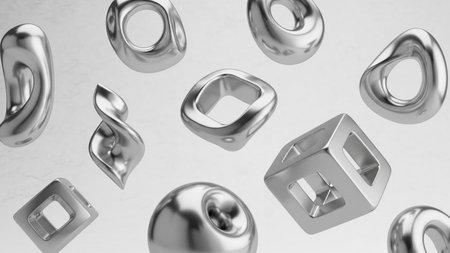 With showing collection of abstract metallic 3d shapes with smooth, reflective surfaces on a light gray background....